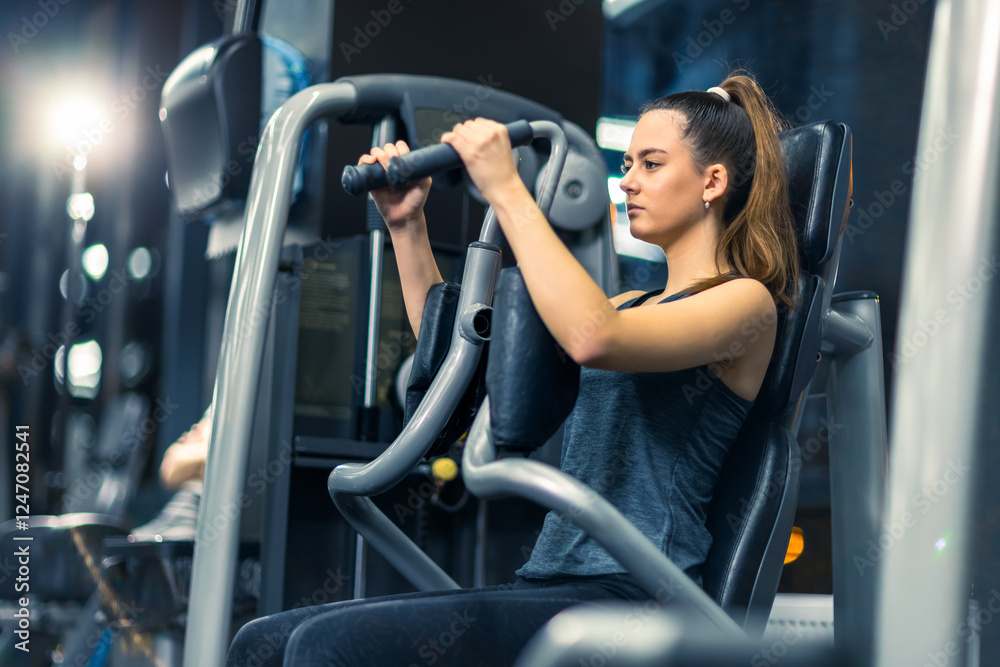 Fit sporty girl doing exercise on a arm press machine in the gym.