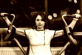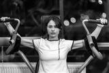 Fit sporty girl doing exercise on a arm press machine in the gym.