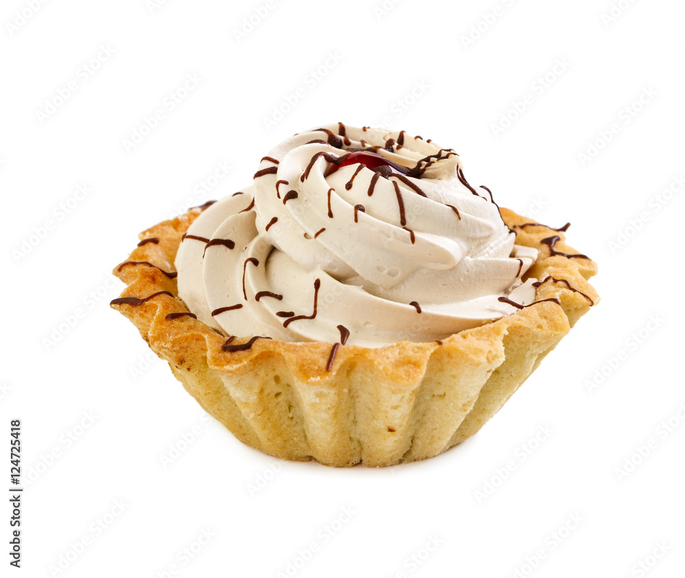 Cake basket with cream-brulee and jam, is watered chocolate syru