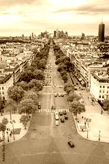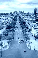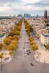La Defense Financial District Paris France in autumn. Traffic on Champs-Elysees with orange and yellow trees aside. Modern vs. Old architecture