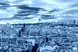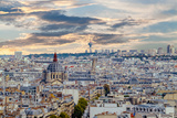 Aerial view of Paris, France. Sunset, buildings and warm light. Shot in october daylight.