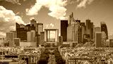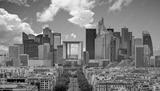 La Defense Financial District Paris France in autumn. Traffic on Champs-Elysees with orange and yellow trees aside. Modern vs. Old architecture. Blue sky with clouds.
