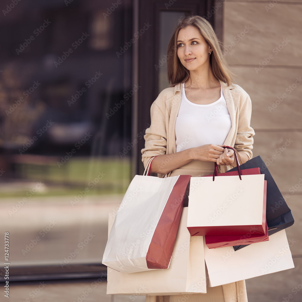 Young happy woman with shopping bags walking on street.