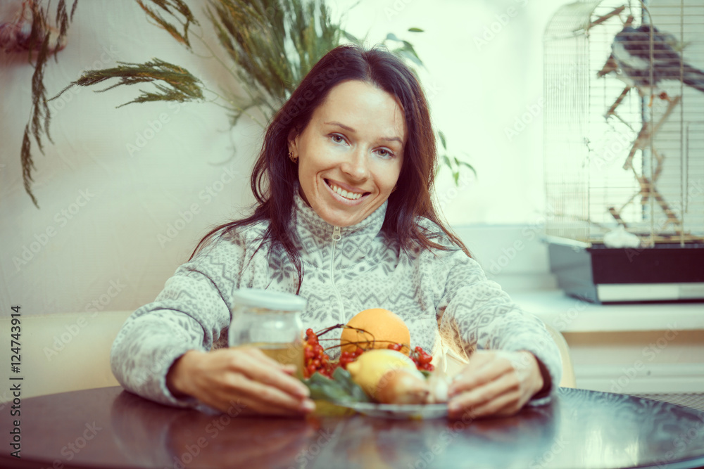 Joyful woman presenting an orange against white background