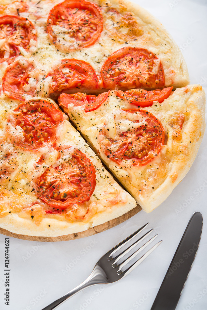 Pizza with tomato, cheese and dry basil on white background. Italian cuisine.