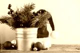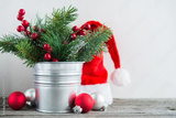 Christmas composition with spruce, red berries, santa hat and silver, red xmas ornaments on white and rustic wood background close up. Merry christmas card. Winter holiday theme. Happy New Year.