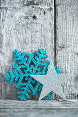 Silver star and blue snowflake on rustic wood background. Merry christmas card. Winter holiday theme. Happy New Year. Space for text.