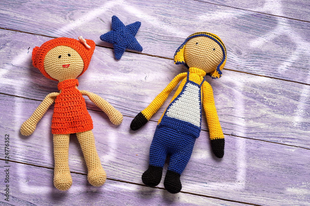 Drawing of house and sun by light, and amigurumi crochet children toys as a concept of mortgage