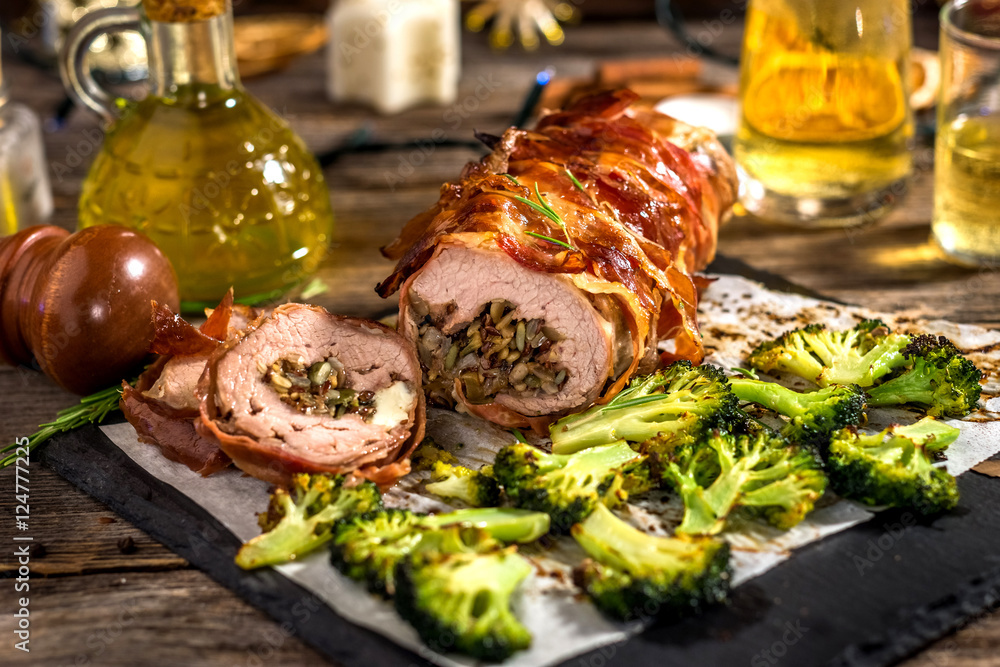 Veal roll rolled with prosciutto and filled with seeds and feta