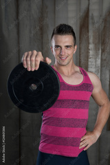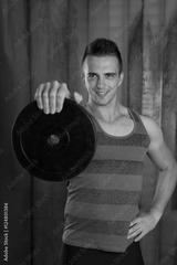 Muscular man doing exercise with weights in crossfit gym against