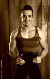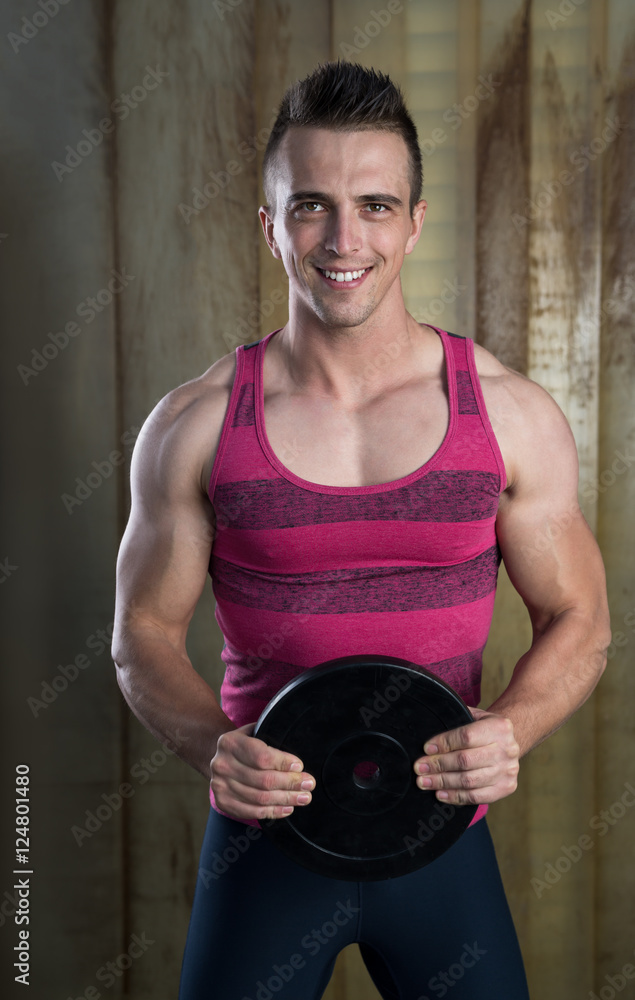 Portrait of muscular young man in sportswear standing against ru