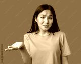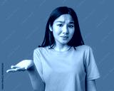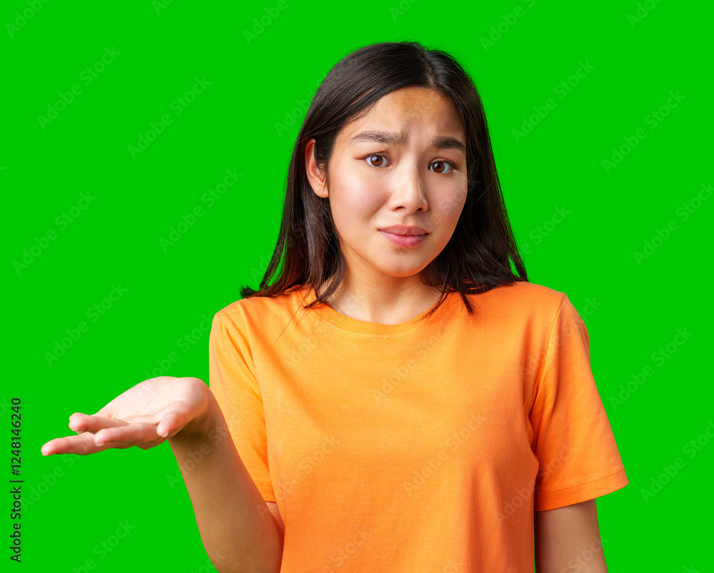 Young woman in orange shirt gestures with uncertainty against a bright green background