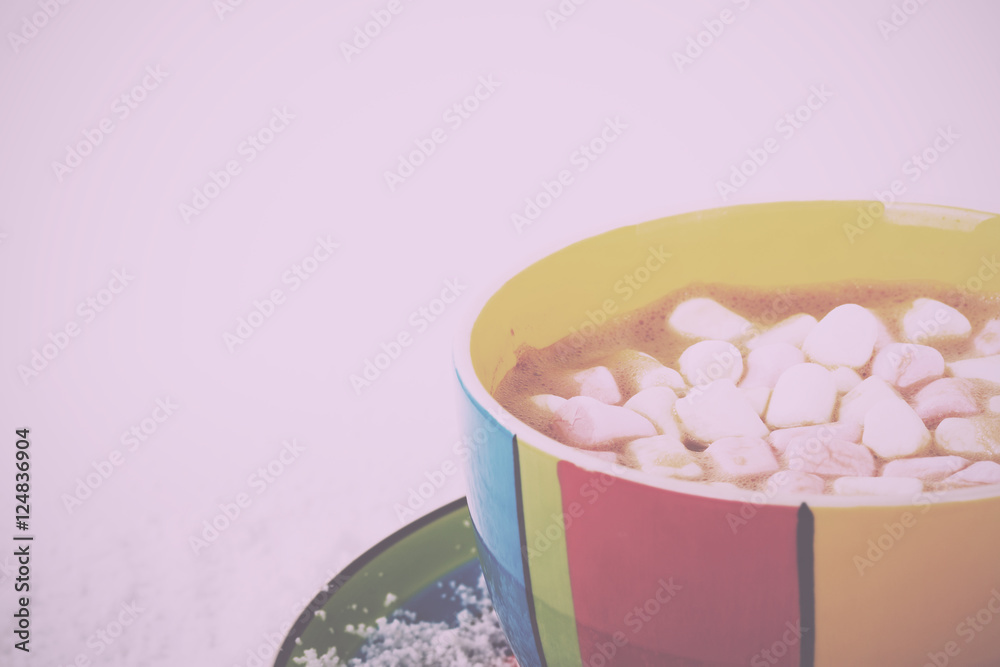 Hot chocolate in a bright colourful cup Vintage Retro Filter.