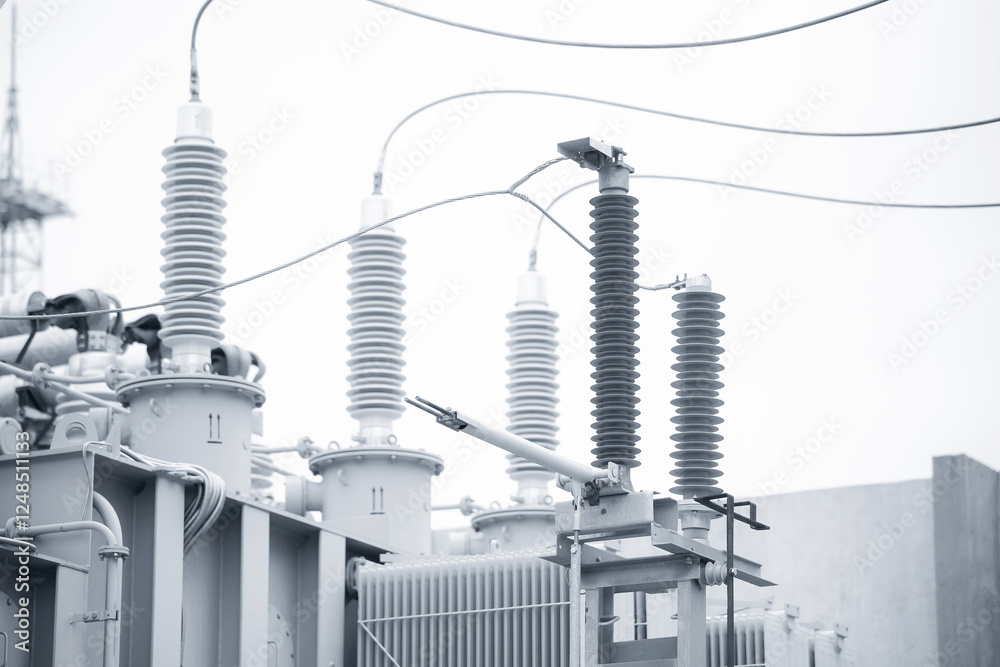 Electrical substation with high voltage switches, wires, transformer, ceramic insulators