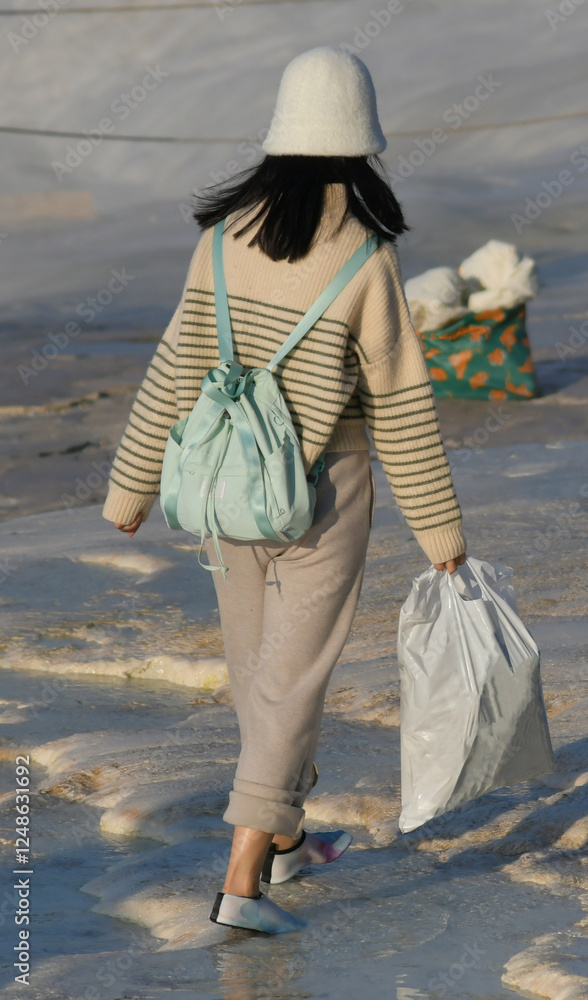 Eine Frau läuft auf den Travertinen von Pamukkale in Denizli