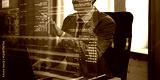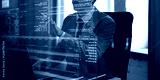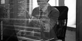 Man in suit using futuristic virtual interface with lines of fictional code and performance analysis. Floating screen overlay suggests advanced digital technology. Concept of IT engineering