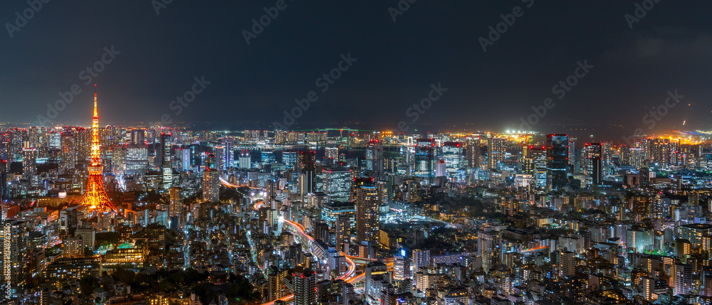 Panoramic view of Tokyo central area with Tokyo tower at night