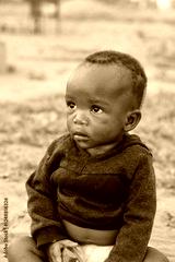 African village, single African hungry baby child , sitting in the yard , challenges of famine, poverty in rural communities, need for humanitarian aid from NGO charity social workers