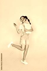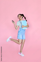 Happy pretty smiling Asian girl student with ponytails holding copybooks using mobile cell phone wearing striped t-shirt and denim looking at smartphone jumping isolated on pink background. Full body