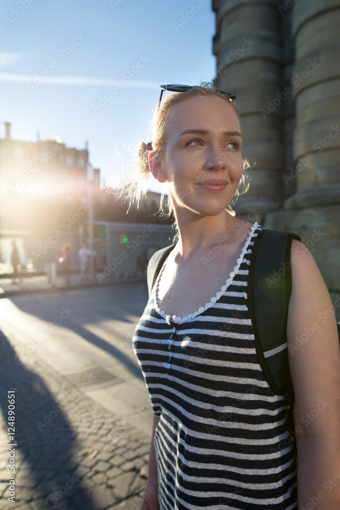 Portrait of a Stylish Pretty Young Woman traveling throug city