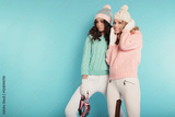 fashion studio photo of beautiful girls with curly hair in warm cozy winter clothes