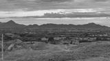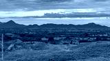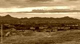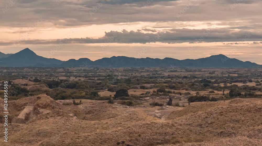 Panorama of the Tatacoa desert with a morning light. Dunes, bushes, sand, dry arid earth, cactus, clouds, sunset in the horizon. Villavieja, Huila, Colombia,