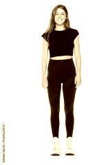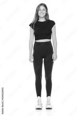 Young smiling woman in black crop top and high-waisted leggings. Long brown hair. Full-body shot against white background. Wearing white sneakers. Neutral expression