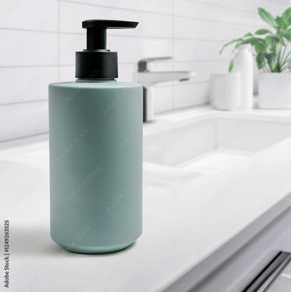 A beautifully designed modern bathroom scene showcasing stylish blue soap dispenser mockup