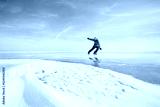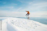 Man in yellow jacket ice skating on frozen lake