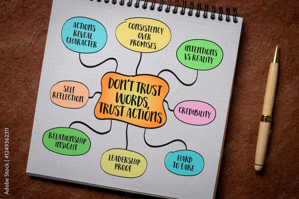 Don't trust words, trust actions, evaluating people intentions and character based on their behavior rather than what they say. Infographics sketch.