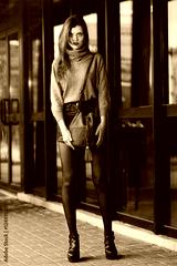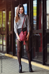 Outdoor full body portrait of a young beautiful fashionable woman posing on the street, holding red leather bag. Model wearing stylish clothes. Girl looking at camera. Female fashion concept.