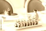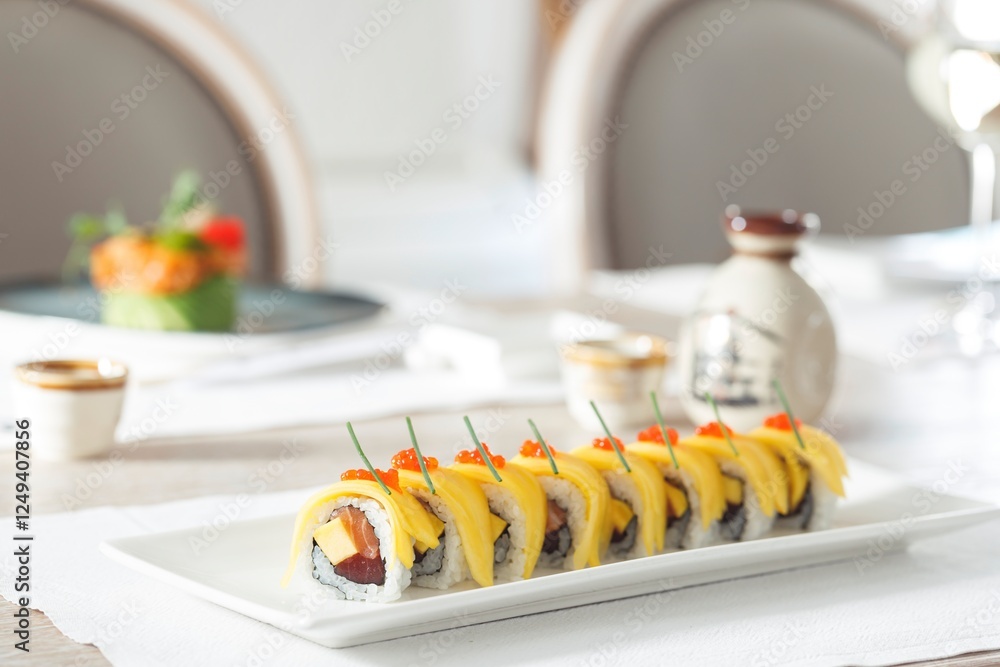 A charming and elegant sushi restaurant showcases a beautiful platter of delicately crafted sushi rolls, expertly prepared by a renowned chef. Perfect for a gourmet take-away experience