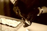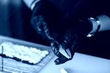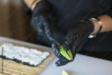 Skilled hands delicately slice fresh avocado, preparing for delicious sushi creations in a cozy restaurant environment. A blend of artistry and freshness awaits customers seeking take-out