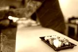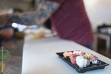 Freshly crafted sushi takes center stage as a talented chef skillfully assembles vibrant fish delicacies, perfect for take-away. Enjoying fine dining flavors at an intimate spot