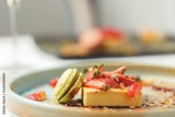 Exquisite dessert crafted with fresh ingredients, featuring strawberries and a delicate macaron