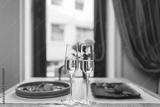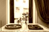 Delightful sushi dishes and elegant desserts adorn the table, accompanied by glasses of sparkling wine, perfect for a romantic celebration on Valentine's Day