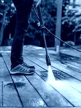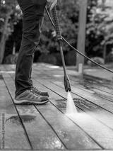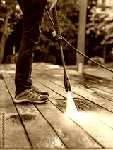 cleaning terrace with a power washer - high water pressure cleaner on wooden terrace surface