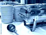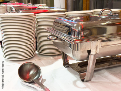 Buffet catering setup with stainless steel chafing dishes and stacked plates