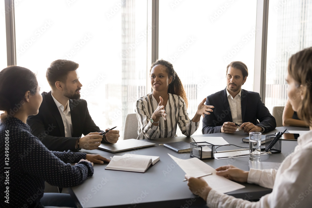 Young 30s African team leader make speech, hold meeting with shareholders, provide information, share opinion, talk about project details, corporate strategy, forecasting, brainstorming in boardroom
