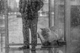 A man stands next to a bench with a cat on it