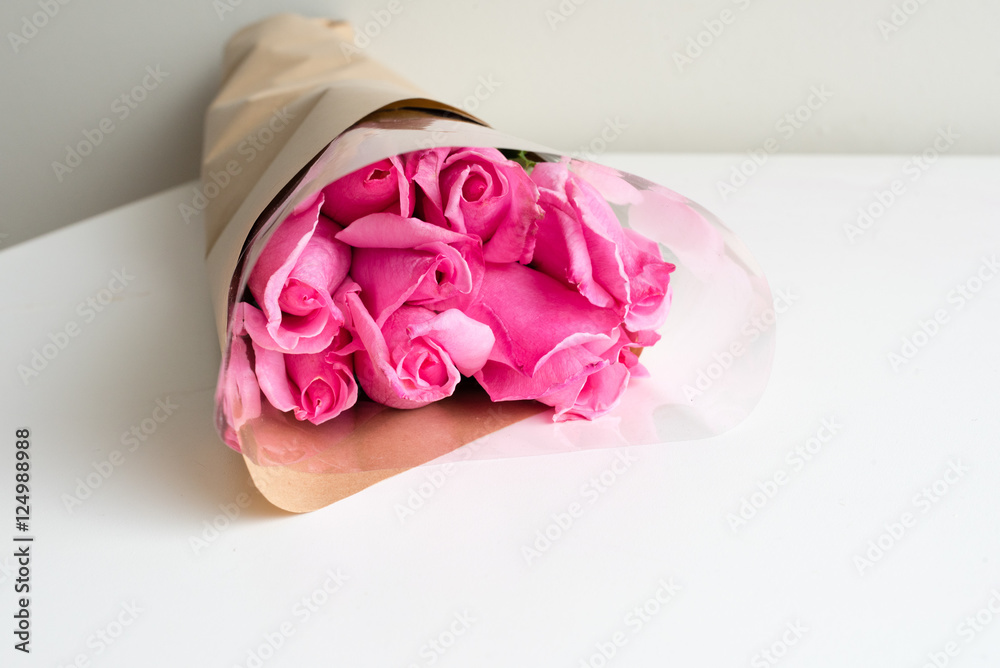 Close up of pink roses wrapped in brown paper and cellophane on white table (selective focus)