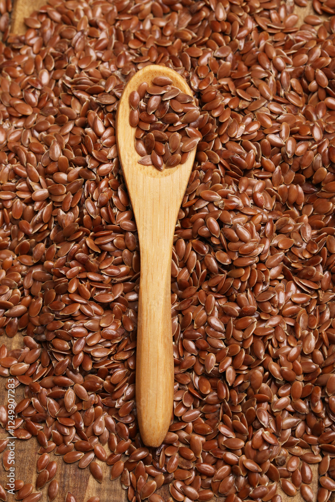 spoon with flax seeds on flax background