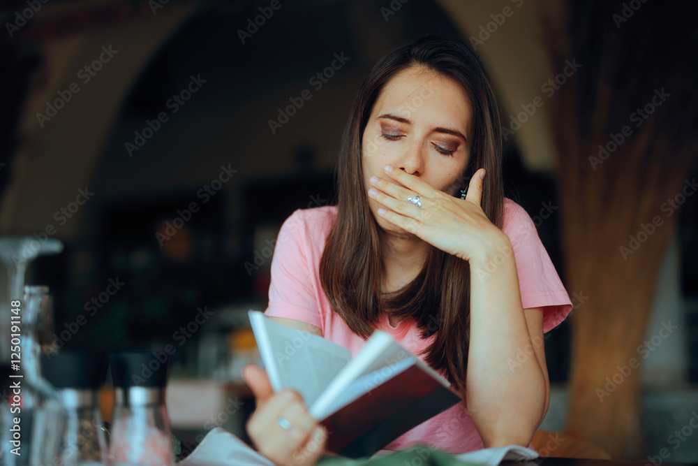 Bored Woman Yawning While Reading a Bad Novel. Girl waiting for her food ordered in a restaurant while reading a book