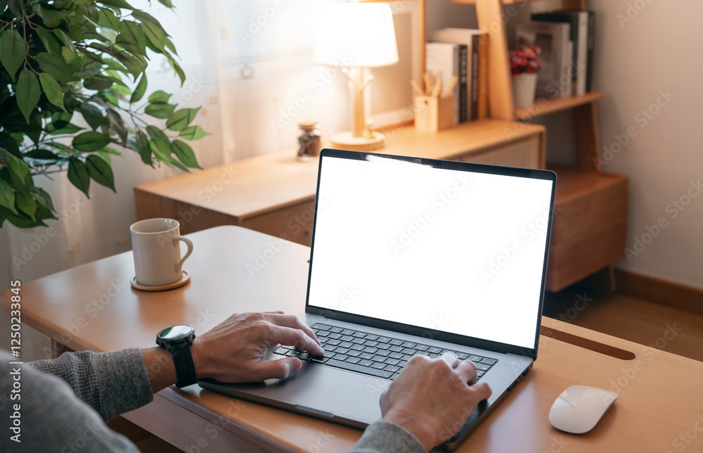 Close-up image of a man working on laptop computer at a table, typing on the laptop keyboard. the laptop with a white screen mockup