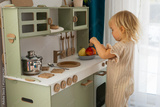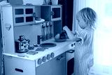 cute toddler blonde baby girl playing on toy kitchen at home,