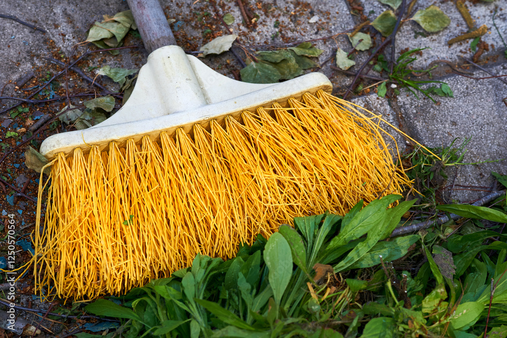 Cleaning the yard.Yellow plastic mop sweeping trash
