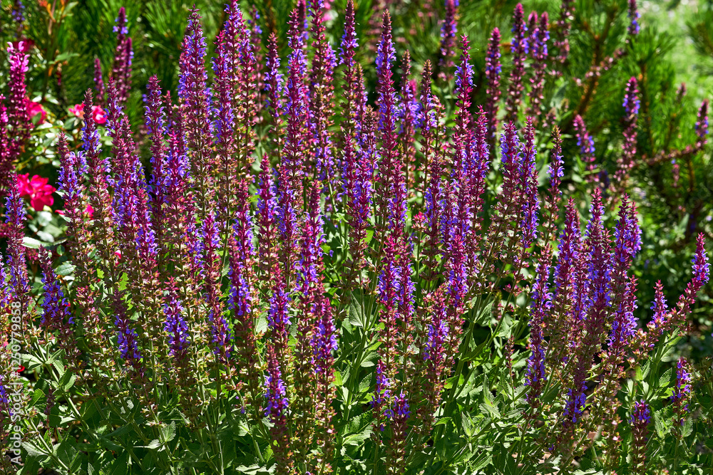 Gardening.Pink magenta sage salvia flowers,spring meadow,lush vegetation
