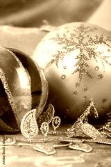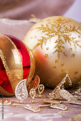 Festive gold Christmas decorations on fabric background