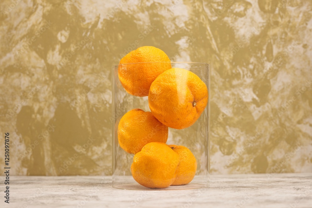 Five vibrant yuzu lemons are gracefully stacked in a transparent glass vessel, showcasing their unique shape and color against a warm, textured background that enhances their natural beauty