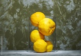 A collection of bright yuzu lemons sits elegantly in a transparent glass vase, highlighting their alluring yellow hue. The textured backdrop enhances the presentation, adding depth and character